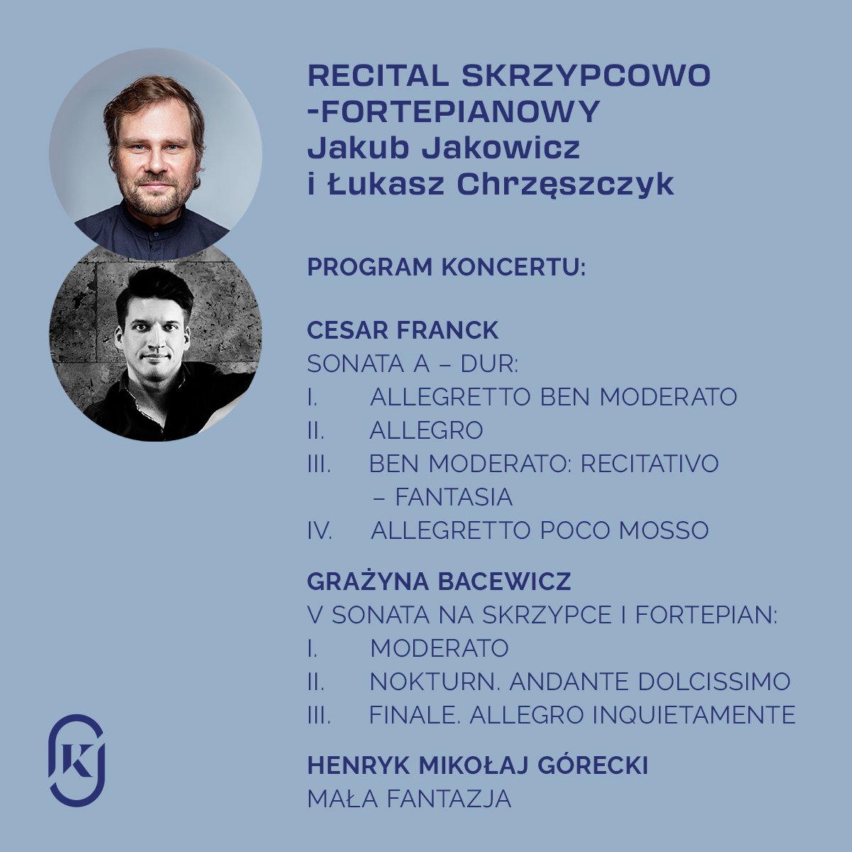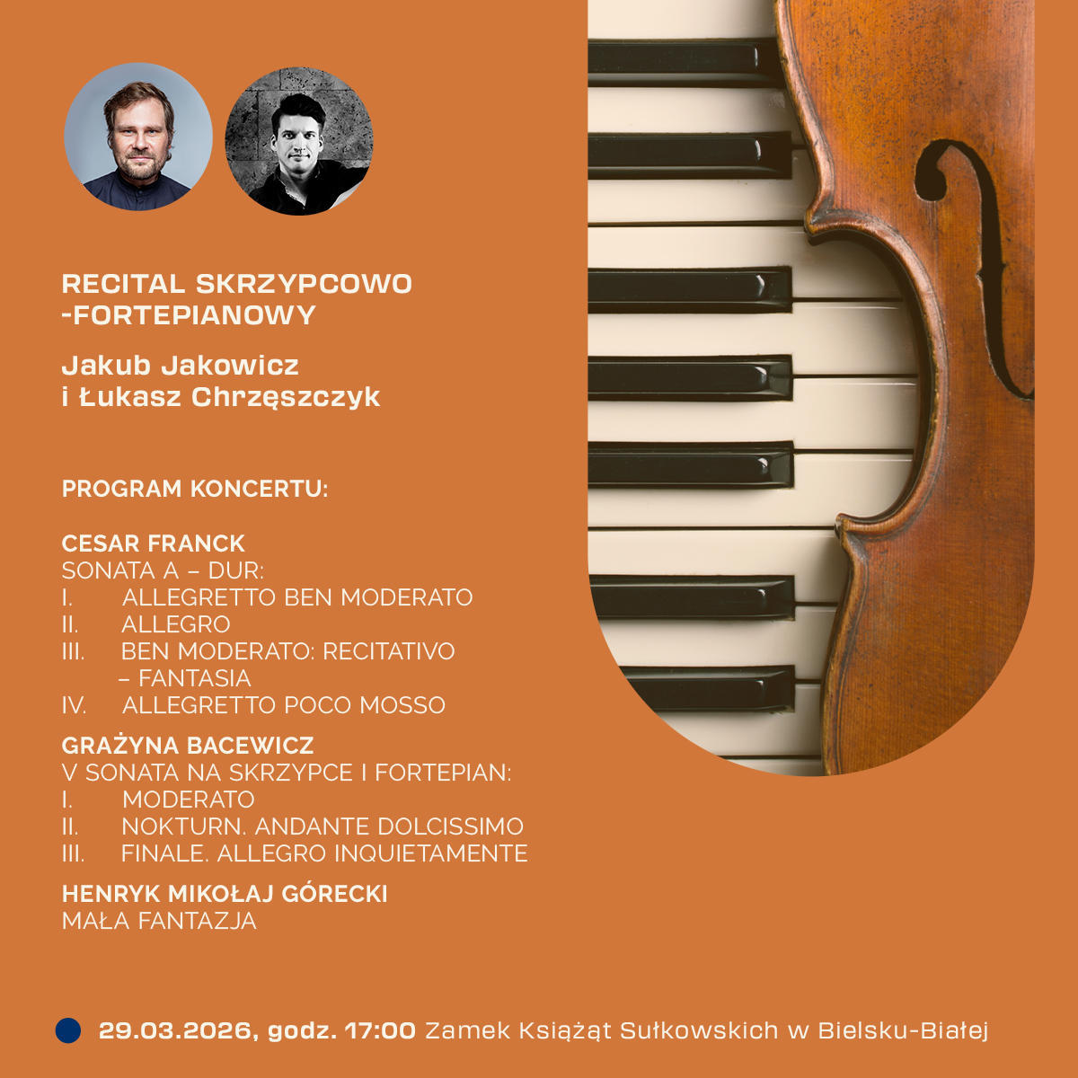 Po rozmowie publiczność usłyszy recital skrzypcowo-fortepianowy w wykonaniu Jakuba Jakowicza i Łukasza Chrzęszczyka.